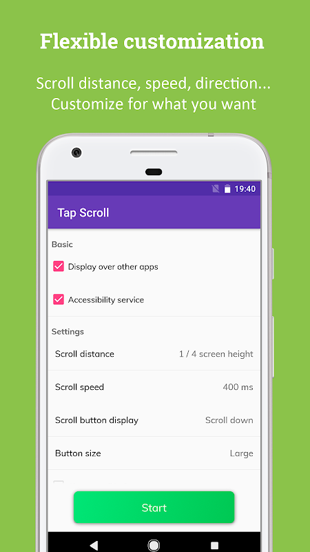 Tap Scroll is very customizable. You can change scroll distance, speed, direction, button size and button transparency all according to your needs.