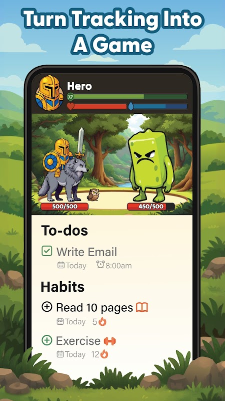 Je dagelijkse doeltracker stimuleert je voortgang in een prachtige gamewereld. Ontmoet monsters, ontmoet eigenzinnige personages en help mensen in nood!