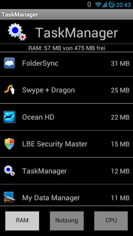 With a short touch on an app you do terminate it, with a long touch you switch to it You could switch between the different views with the 3 buttons or with a "swipe" to the left or right. Of every app you could see memory usage, processort time and cpu load.