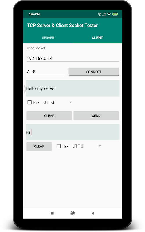 Application's main purpose is to  test TCP sockets with another mobile devices or Desktop applications .