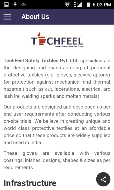 TechFeel Safety Textiles Pvt. Ltd gespecialiseerd in het ontwerpen en vervaardigen van persoonlijke beschermingstextiel (bijvoorbeeld handschoenen, mouwen, schorten) ter bescherming tegen mechanische en thermische gevaren (zoals knippen, snijwonden, elektrische boog zweep ire, lasvonken en gesmolten metalen).