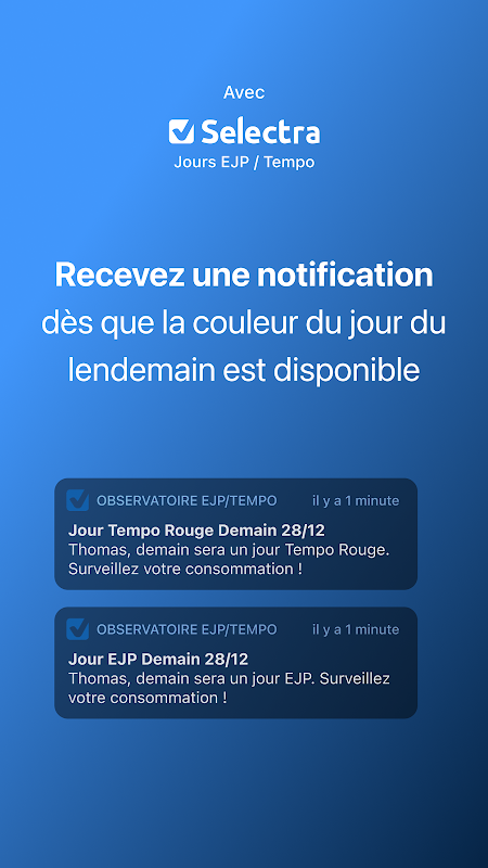 - Zodra de kleur voor de volgende dag bekend is, ontvang je een melding als het een Rode en/of Witte (Tempo) dag is. In het geval van een EJP-dag (EDF's EJP); in het geval van een dag van nuchterheid en/of bonus (EDF's Zen Flex); in het geval van een piekdag (Enercoop's Flexi Watt); in het geval van een bliksemdag (TotalEnergies' Eco+ Hours); of in het geval van een dag van sereniteit (Ohm Énergie's Modulo)!