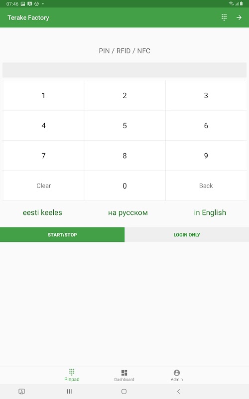 Dit is de standaardinstelling voor de Pinpad-weergave. Met de juiste toegangen (dwz de gebruiker voert de juiste pincode in), wordt de huidige taak gewisseld. Als er een taak bezig is voor de gebruiker, wordt deze beëindigd. Als de gebruiker geen lopende taak heeft, wordt een nieuwe taak gestart. Als de gebruiker een geplande of geplande taak heeft voor een bepaalde periode, begint de geplande taak. Als dit niet het geval is, zoekt het systeem naar het geselecteerde jobtype uit de laatste / meest geselecteerde jobs. Indien niet gevonden, maakt het een nieuwe job aan met de externe ID "Gestart vanaf mobiel apparaat" en start dit jobtype voor de gebruiker. NB! U kunt dit automatisch gegenereerde jobtype een andere naam geven.
