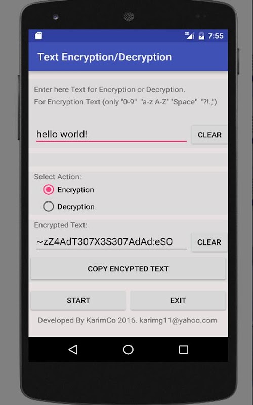 Simple text encryption - decryption application.Tested on Samsung Galaxy S5 (Android 5.0).