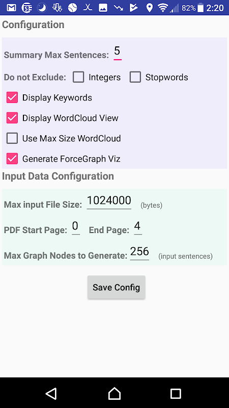 Text Explorer can be configured to adjust what the ranking algorithm ignores, and the maximum number of sentences it will produce in the generated summary. And it also allows the user to select the start and end pages of the PDF file to be used in the summary, so an entire PDF book could be used as input.