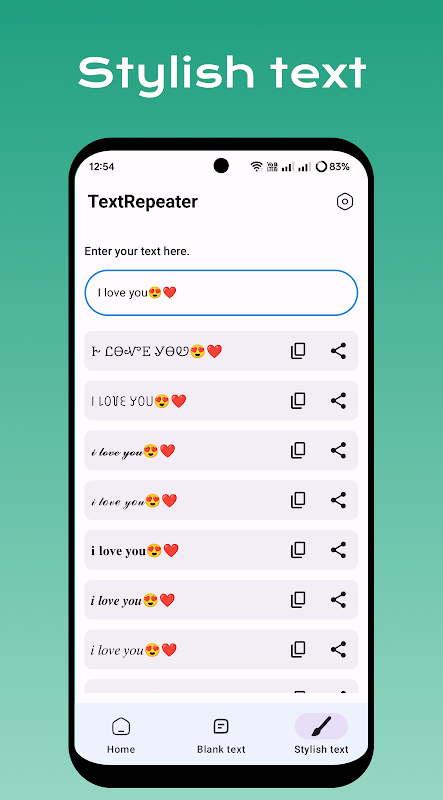 📋 Met de tekstkopieer- en plakoptie kunt u herhaalde tekst delen met uw geliefde vrienden in chats, documenten, posten op sociale netwerken of tekst gebruiken voor een verhalenmaker. Het helpt om herhaalde tekst snel en gemakkelijk te verzenden.