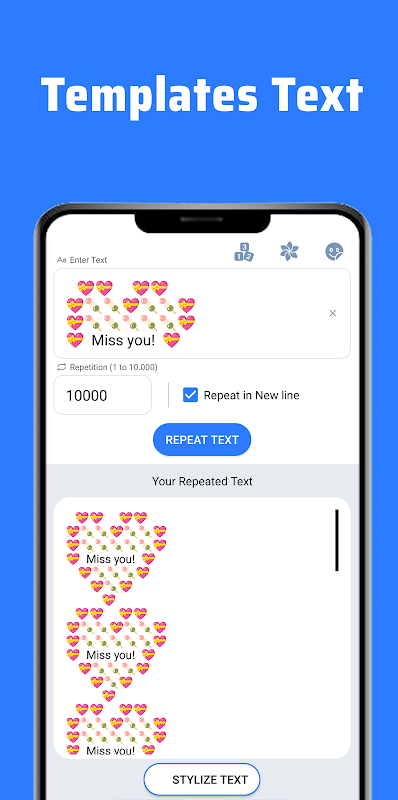 - Veelzijdigheid: voer een willekeurige tekst in en kies het aantal herhalingen, van 10 tot 10.000. Of het nu gaat om testen, onderzoek of creatieve projecten, onze app voldoet aan uw behoeften.