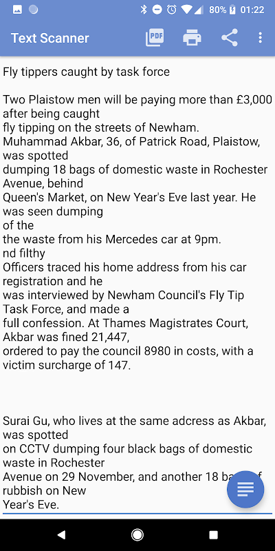 The text will show in the app where you can view it, edit it, share it with any other app, save it as a file or send it to a printer or create a PDF with it using PDF Creator.