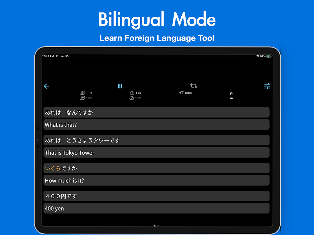 Tweetalige modus: Deze modus is ontworpen voor tweetalige teksten, waarbij elk paar zinnen uit twee regels bestaat. Text2Speech leest de tekstinhoud van elke taal afzonderlijk voor elk paar zinnen, waardoor het handiger wordt voor tweetalig leren of vertalen. Voer gewoon het document met de tweetalige zinnen in de toepassing in en Text2Speech leest elk paar zinnen achter elkaar voor, zodat u beide talen beter kunt begrijpen en leren.