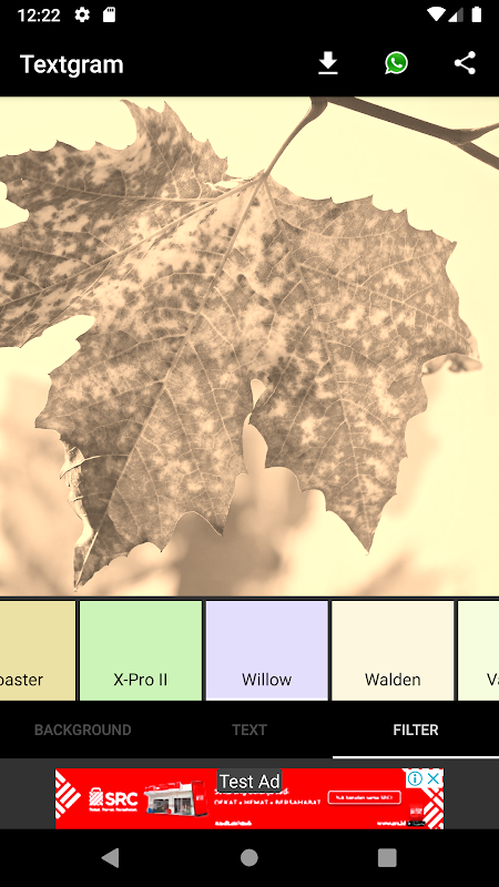 In the menu FILTER Textgram - Text on Photos, you can filter your text that you created with beautiful filter. Very easy to use, only click on the filter that you want and you can see the applied filter instantly.
