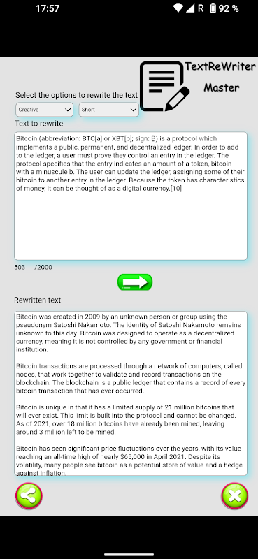 Met TextoReWriter Master kunt u de kwaliteit van uw geschriften verbeteren en plagiaatproblemen voorkomen. De kunstmatige intelligentie van de app zorgt ervoor dat elke parafrase uniek is en is afgestemd op uw specifieke behoeften. Bovendien kunt u dankzij de intuïtieve en gebruiksvriendelijke interface teksten met slechts een paar klikken parafraseren, wat u tijd en moeite bespaart.