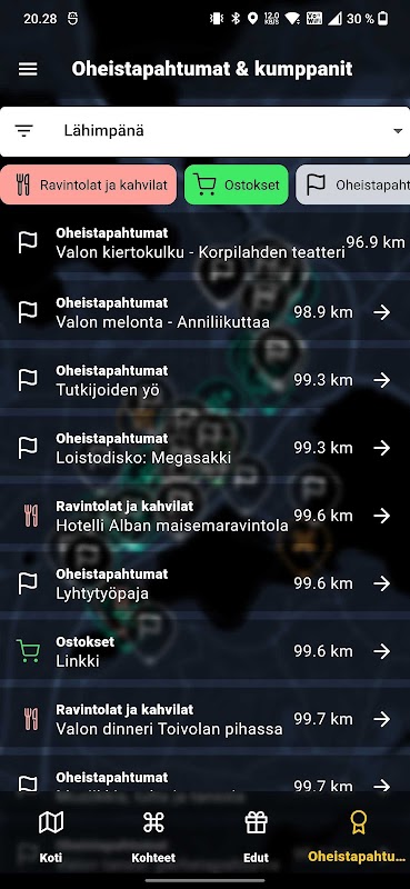 De applicatie presenteert de verlichtingsbestemmingen in de stad Valo en de voordelen van partners.