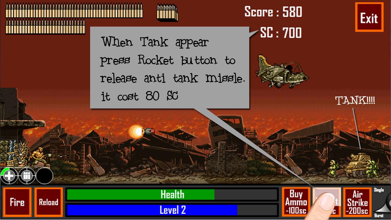 Play as a commando, put a metal slug into each enemy soldier with your machine gun, enjoy classic arcade 8-bit graphics, blow tanks up with missiles.