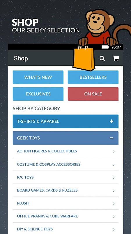 With the ThinkGeek mobile app, you have the premier retailer for the global geek community in your pocket. Shop our curated collection of goods, check out what's trending in the geek world, and be entertained by like-minded people. It's basically like using our mobile site, only cranked up to 11 or over 9000, depending on your fandom. Timmy hopes you dig it.