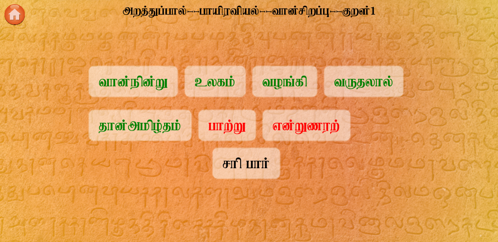 Zoek de Thirukkural uit de willekeurige zeven woorden. Sleep de woorden naar de juiste positie en gebruik de vinkknop om hun plaatsing te verifiëren. Als het woord groen wordt weergegeven, is de positie correct. Als het woord rood wordt weergegeven, is de positie ervan onjuist.