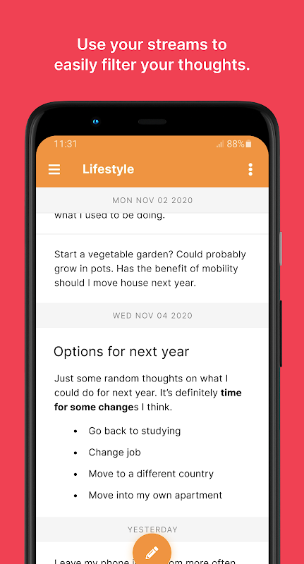 This is not your typical note taking app. Thoughts that you record into notes here are displayed in their entirety within an infinitely scrolling list like a messaging app. Your most recent note is presented at the bottom of the list and scrolling up will reveal to you a history of all your previously recorded notes.