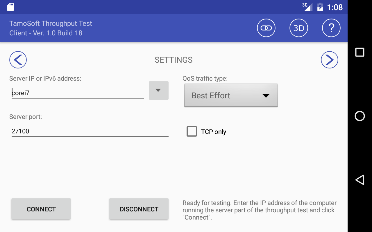 Installeer de server deel aan de bedrade kant van uw netwerk, en gebruik dan deze cliënt deel draait op je Android-toestel om de prestaties te meten. Voer het IPv4- of IPv6-adres van de server en klik op Verbinden. De klant zal proberen om verbinding te maken met de server, en als de verbinding succesvol is, zal continue verwerkingscapaciteit testen beginnen. Veeg de grafiek TCP en UDP-throughput, UDP verlies, en round-trip tijd te zien. De volledige documentatie is beschikbaar hier .