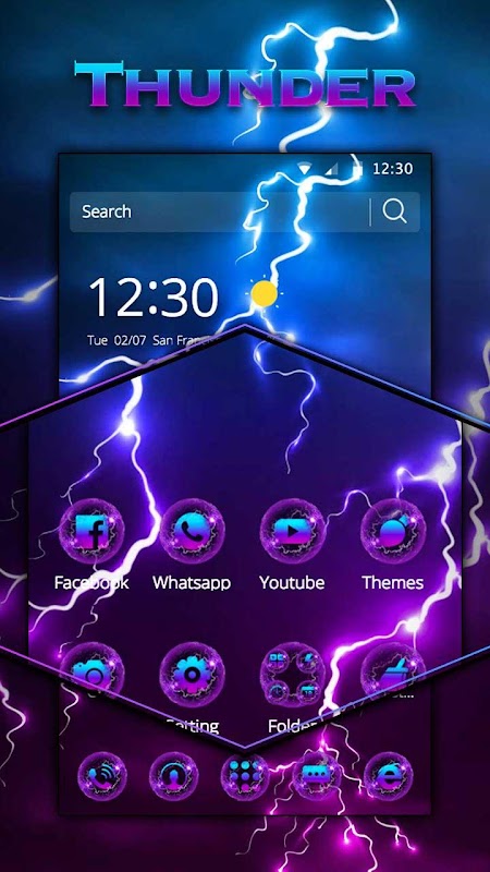You can get cool Thunder theme with purple lightning live wallpaper and neon light lock screen and pink thunder icons pack! Thunder theme is an Android mobile theme with 3D effects, 3D weather, delicate app icon packs and cool lightning wallpaper. Thunder Theme is supported on most Android devices. Install the theme for a 3D home screen and to make your phone look cool!