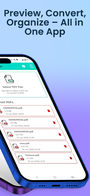 Zeg vaarwel tegen grote TIFF-bestanden – converteer ze met één tik naar PDF! Download nu en ervaar de snelste en meest betrouwbare TIFF-naar-PDF-conversie op je telefoon.