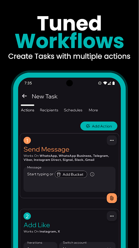 Maak workflows met meerdere acties en stappen voor meerdere kanalen, zodat één workflow verschillende apps tegelijkertijd met verschillende acties kan targeten. Stel flexibele planning in voor dezelfde workflow, zodat deze wordt uitgevoerd wanneer jij dat nodig hebt.
