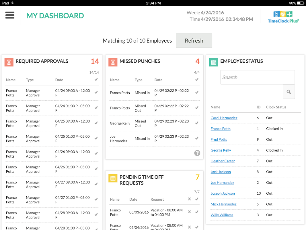 • Instantly access your customized dashboard and widgets to get the information that is most important to you such as missed punches, approaching overtime, and required approvals.