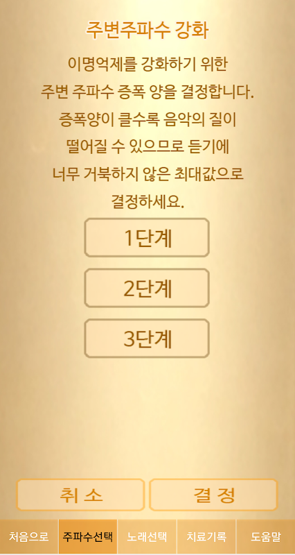 *실시간으로 음악에 존재하는 이명주파수를 처리하기 때문에 사용하는 모바일 기기에 따라 음악이 끊어지는 현상이 발생할 수 있습니다. 이와 같은 경우 홈페이지에서 PC 프로그램을 다운받아 사용하시길 바랍니다.