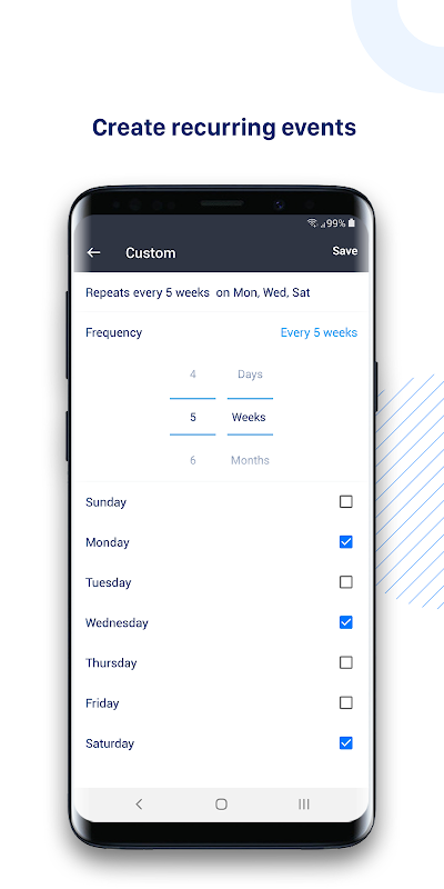 Tiny Calendar ondersteunt 8 standaardweergaven - dag, week, maand, 4 dagen, jaar, mini-maand, weekagenda en agenda. U kunt direct van weergave wisselen om evenementen te ontdekken of een tijd te vinden waarnaar u op zoek bent.