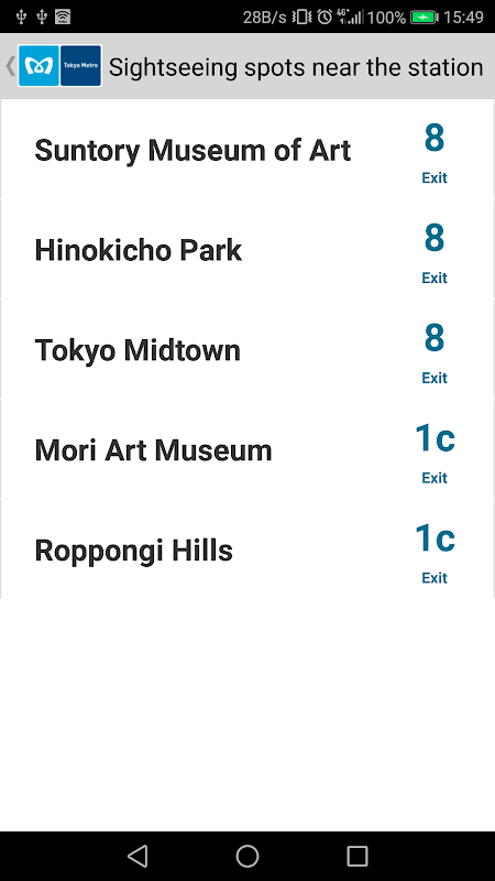 By simply touching the station names on the map, you can easily search for a route, or instead you can select your arrival and departure stations by using the landmark search functionality to search for the name of tourist spots such as Tokyo Tower or Senso-ji Temple or for the name of popular hotels. This application displays the main route, time required, and fares in a simple easy to understand format. Also because the application allows you to find the closest exit to landmarks near the station, you can stop worrying about navigating the huge number of subway exits, and simply relax and enjoy using the subway to sightsee around Tokyo. You can also use the application to check which stations offer a free Wi-Fi service.