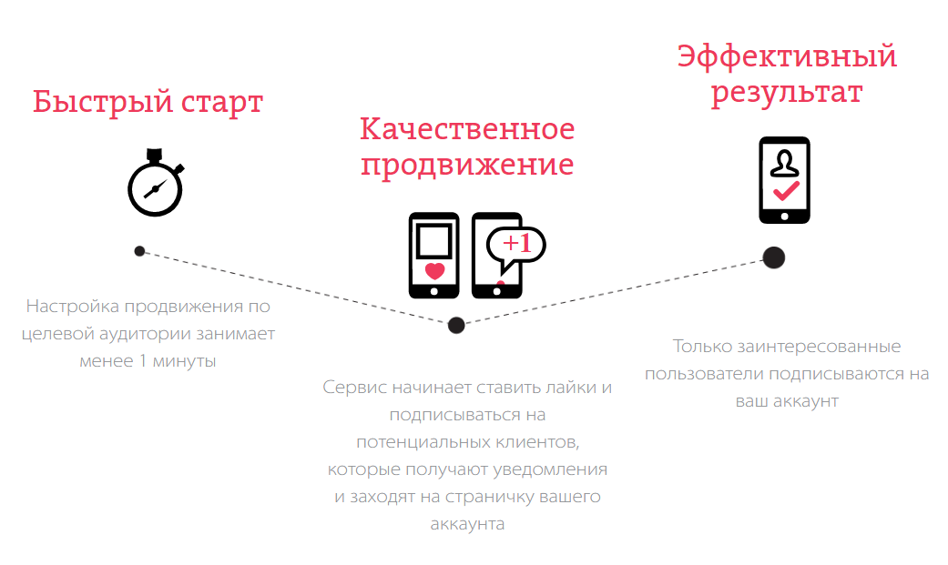 Уже через несколько минут после запуска Вы сможете начать получать клиентов. В автоматическом режиме Вы взаимодействуете с целевой аудиторией, делая тысячи подписок и ставя лайки
