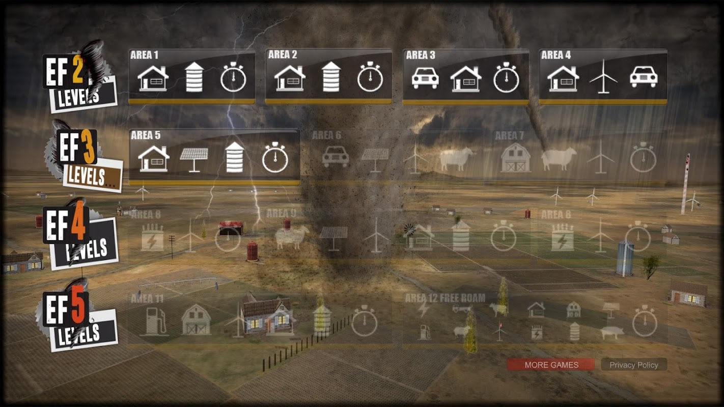 Neem de volledige controle over deze kracht en vernietig zoveel mogelijk dingen, groei van een EF2, EF3, EF4 tot je een gigantische EF5-tornado wordt die gebouwen, bomen, auto's, schuren en al het andere dat pech heeft op zijn pad opeet!
