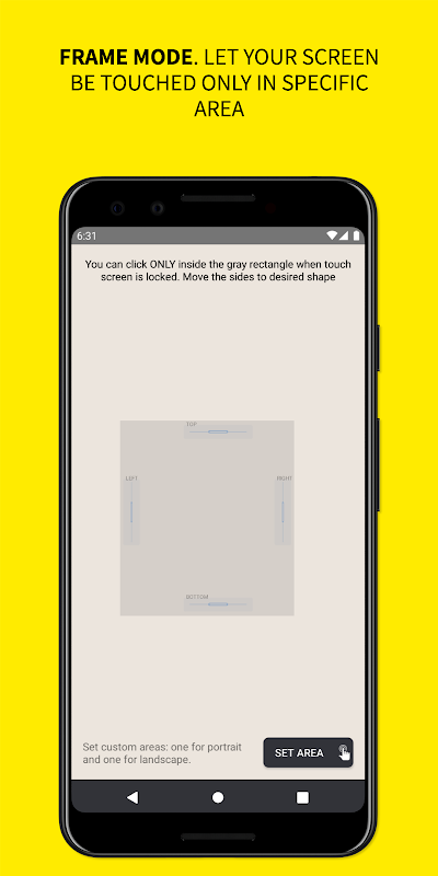 Touch Lock* is allowing users to enjoy the device display without accidental screen touches. The main purpose of the app is to temporary add an overlay over the apps that in preventing any screen touches. It is hiding the soft keys of the navigation bar(Back, Home and Recents buttons) and status bar, making your screen look bigger. It is also preventing users from accidental touching of individual soft keys.