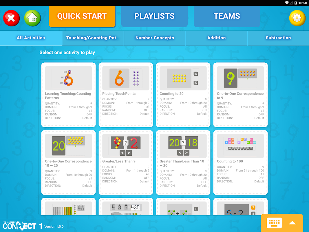 Designed for use with all grade levels and special education, TouchMath Connect allows for customizable playlists and problem choices, lets the user customize the TouchPoints, and has a fun competition mode for student gameplay.