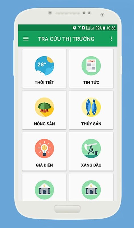 Ứng dụng Tra Cứu Thị Trường giúp bạn tra cứu nhanh thông tin về giá nông sản (cà phê, hồ tiêu, hạt điều...), giá vàng, giá điện, giá xăng dầu, giá thủy sản, tỷ giá ngoại tệ, giá kim cương, lãi suất tiền gởi, lãi suất tiết kiệm.