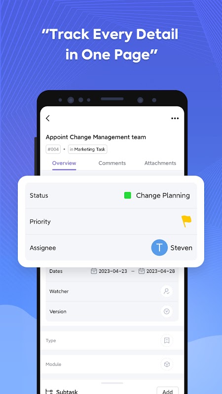 - Gepersonaliseerde taakdetails (status, prioriteit, toegewezen persoon, kijker, datums, type, versie, etc.)