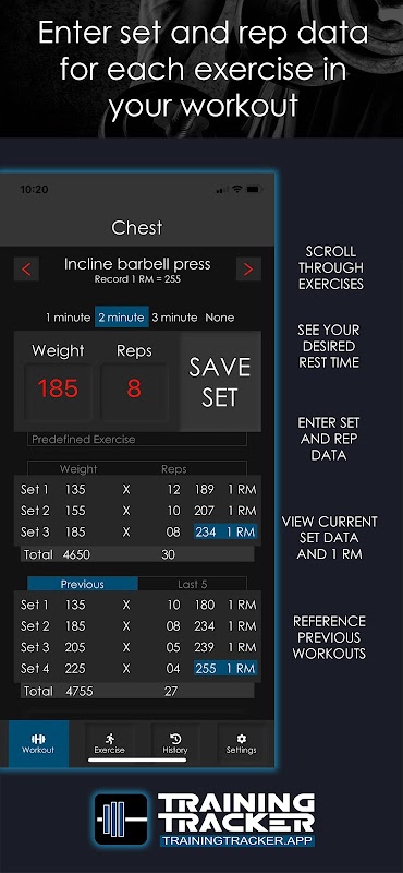 Training Tracker is a simple, powerful, easy to use fitness app for logging weight training workouts and tracking results of performance and body composition.