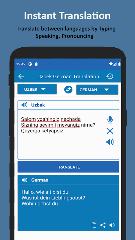 De Oezbeekse Duits Vertaler is de krachtigste vertaaltool op je Android. Vertaal elke zin of woordgroep naar elke doeltaal en profiteer van een aantal handige extra functies, zoals tekst-naar-spraak en geïntegreerde ondersteuning voor sociale media. De Oezbeekse Duits Vertaler is een handige app en is je vertaal- en woordenboekassistent wanneer je op reis bent of voor andere doeleinden.