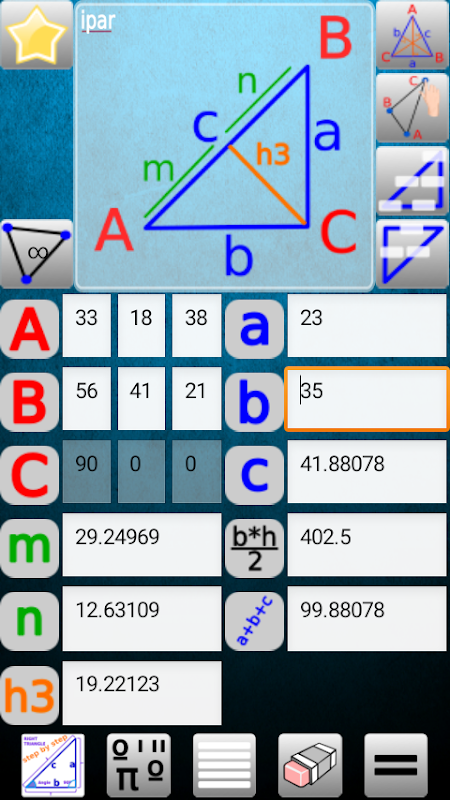 IPAR, Driehoek en Haakse Gratis helpt om wiskundige problemen in verband met de juiste Triangle (stelling van Pythagoras, de goniometrische functies) op te lossen, berekent de schuine zijde en al driehoeken. Nuttig voor alle soorten driehoeken .. Rechthoekige driehoek.