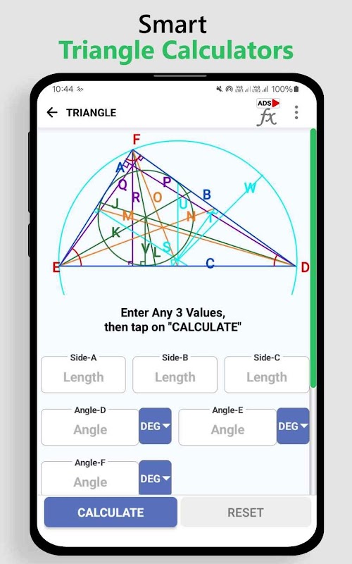 ► Los driehoeken op door drie willekeurige parameters (zijkanten of hoeken) in te voeren om de resterende waarden te vinden zoals gebruikt in trigonometrie.