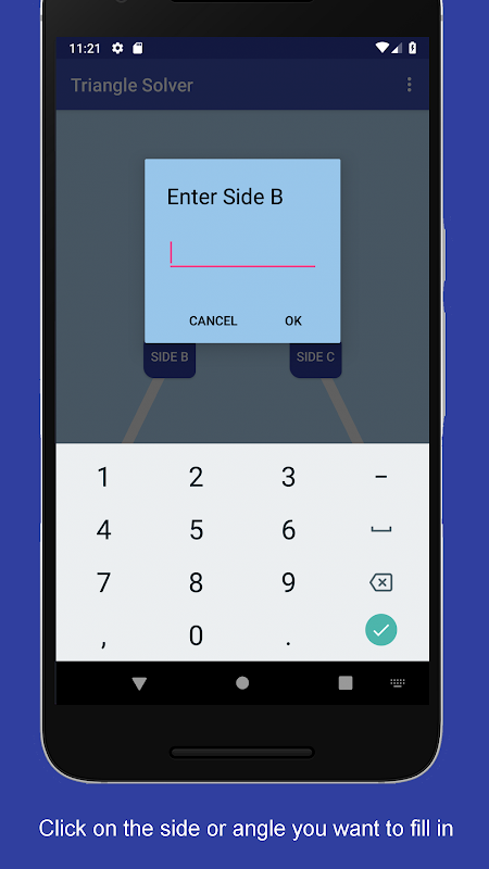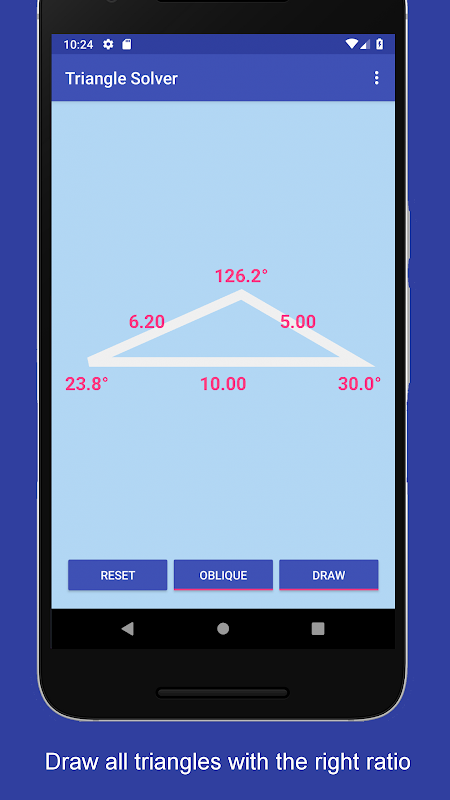 Triangle Solver berekent en lost alle soorten driehoeken op. Juiste driehoeken en schuine driehoeken worden beide ondersteund. Triangle Solver berekent de hele driehoek uit de invoer van de gebruiker. Klik gewoon op een zijde of hoek die u wilt invullen. De resultaten worden weergegeven in een normale driehoek, maar het is ook mogelijk om de driehoek met de juiste verhouding te tekenen.