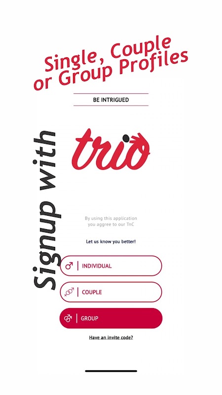 Bij Trio vieren we elke geaardheid en identiteit. Wij geloven dat iedereen het verdient om zijn of haar ware aard te vinden – of je nu hetero, homo, bi, poly of undefined bent. Ons platform is gemaakt voor gedurfde, nieuwsgierige en openhartige mensen die klaar zijn om in alle richtingen een diepe connectie te maken.