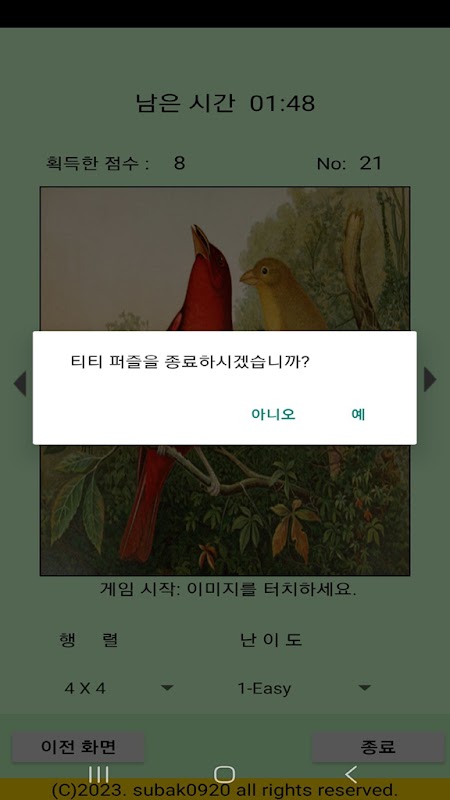 In the bottom picture, if you touch the two squares, the pictures will swap. We made it possible to do a variety of puzzles, from 2-row, 2-column puzzles to 15-row, 15-column puzzles.