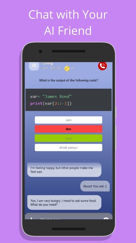 Python leren gemakkelijk gemaakt met de geheel nieuwe turing's Learn Python-app. Python leren met je AI-vriend.