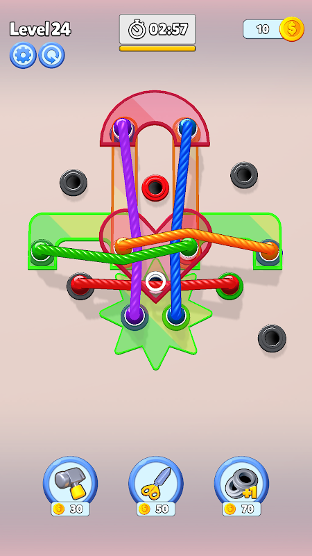 Los uitdagingen op: voltooi elk niveau door alle touwen te ontwarren en ze perfect op elkaar af te stemmen.