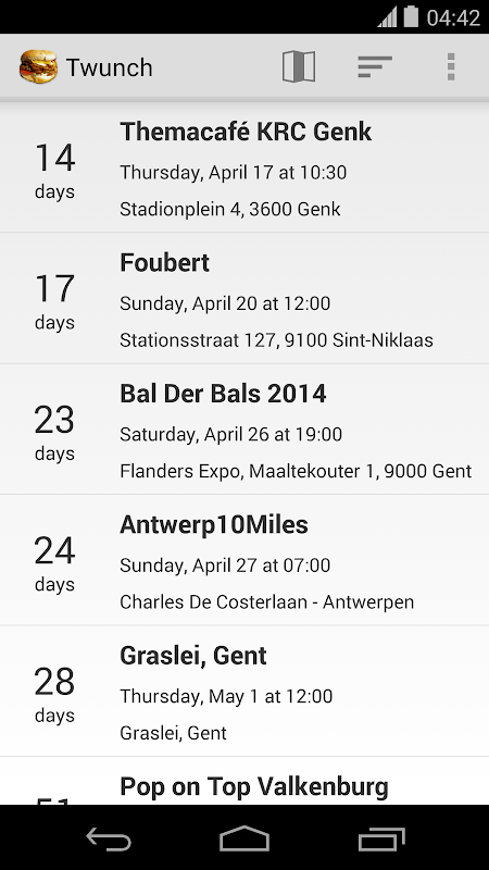 The Twunch Android application lists upcoming Twunches. It shows the date, time, location and participants of each Twunch. You can join a twunch from within the application and find the Twunch location on a map.