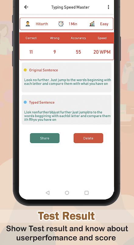 6. Controleer de verkeerde en juiste zin: in de Typing Speed Test-app toont de app de verkeerde zin of het verkeerde woord en corrigeert de zin en het woord, zodat u dezelfde fout niet opnieuw herhaalt.