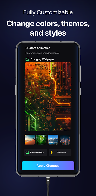 De thema-animator-app voor mobiel opladen selecteert thema's naar keuze en verbaast je vrienden en familie met deze geweldige aangepaste thema's wanneer je telefoon aan het opladen is. De Cool Flashing-thema's verschijnen op uw telefoon wanneer deze op Vergrendelen en opladen via plug-in staat.