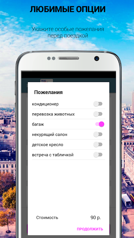 Выбирайте в меню желаемую услугу такси. Что Вы предпочитаете – такси с кондиционером, или некурящий салон?