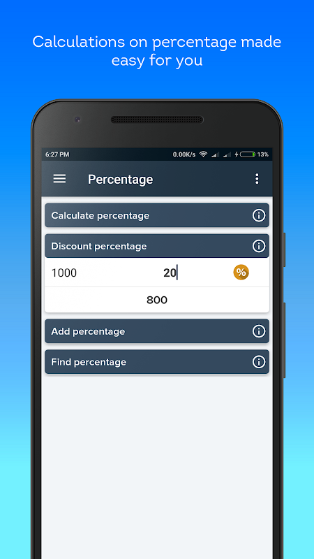 ● Percentage Calculator: This Percentage calculator provides you basic functionalities on percentage useful in daily life. For example,