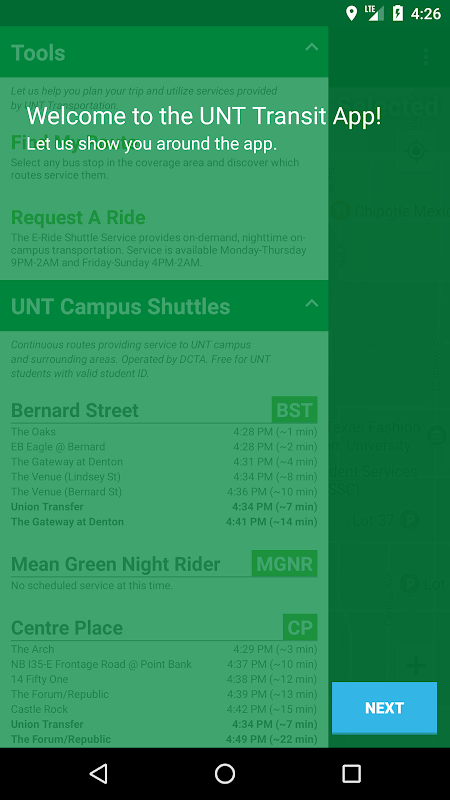 The UNT Transit app is a project developed by and for students at UNT and the North Texas area.