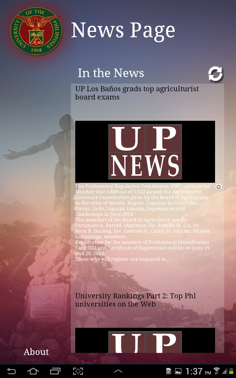 UP NewsApp is a mobile application that displays the latest news found in the website (up.edu.ph). It allows the user to share each news to facebook, twitter and email. Internet connection is needed.